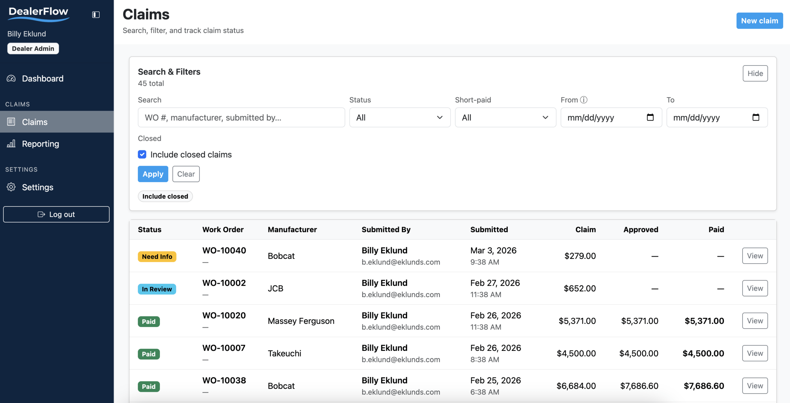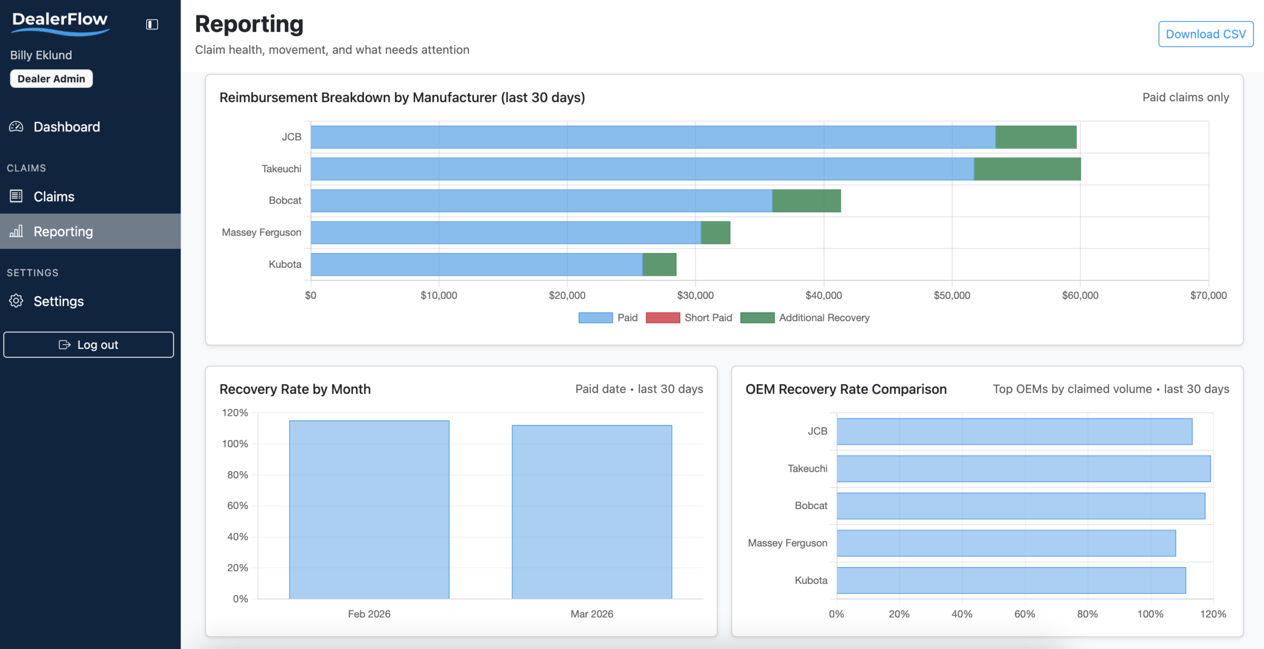 DealerFlow provides equipment dealerships with a centralized platform to manage warranty claims, track reimbursement performance, and gain visibility into warranty operations across OEMs.